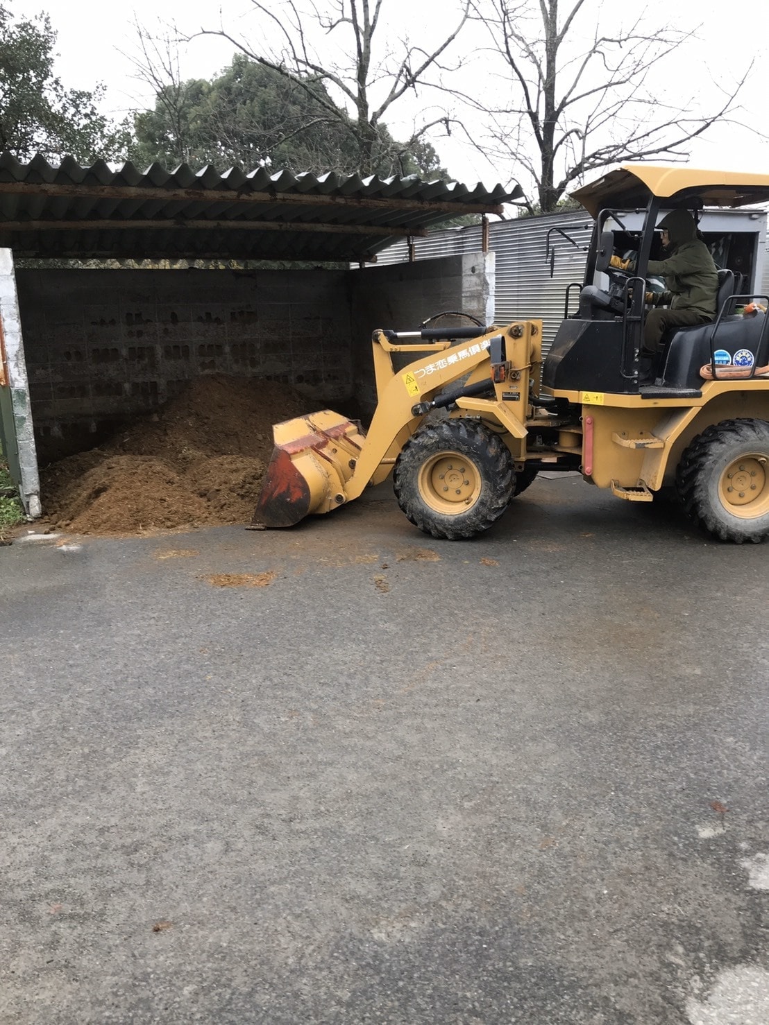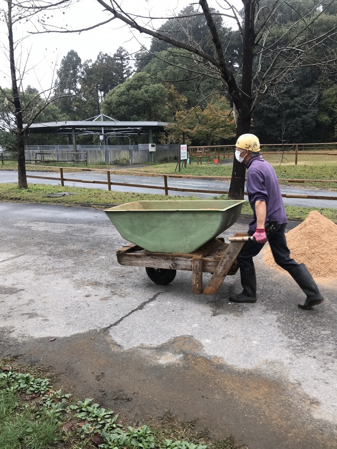 厩舎におが粉を補充するためにおが粉を運びます。